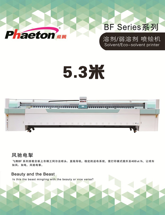 飛騰BF系列搭載全新上市精工阿爾法噴頭、直線導軌,穩(wěn)定的送布系統(tǒng),使打印模式提升至400㎡/h,讓噴車如風、如電,風馳電掣。