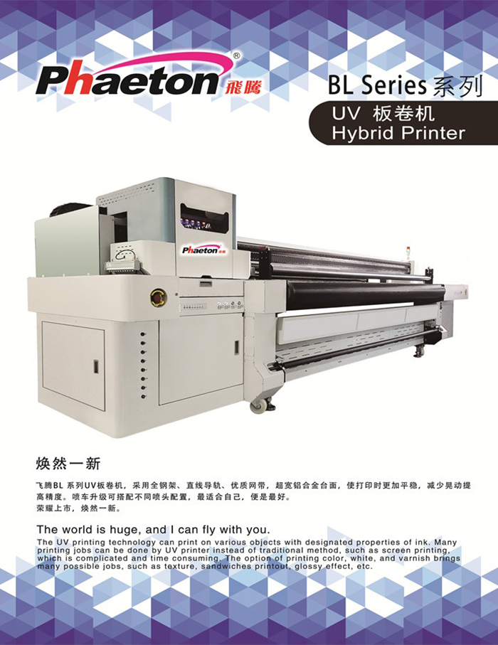 飛騰BL系列UV板卷機,采用全鋼架、直線導軌、優(yōu)質(zhì)網(wǎng)帶,超寬鋁合金臺面,使打印時更加平穩(wěn),減少晃動提 高精度。噴車升級可搭配不同噴頭配置,最適合自己,便是最好。 榮耀上市,煥然一新。