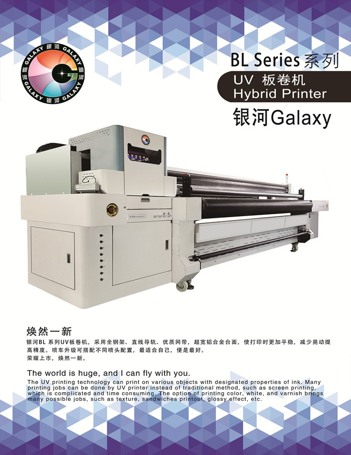 銀河BL系列UV板卷機,采用全鋼架、直線導軌、優(yōu)質(zhì)網(wǎng)帶,超寬鋁合金臺面,使打印時更加平穩(wěn),減少晃動提 高精度。噴車升級可搭配不同噴頭配置,最適合自己,便是最好。 榮耀上市,煥然一新。